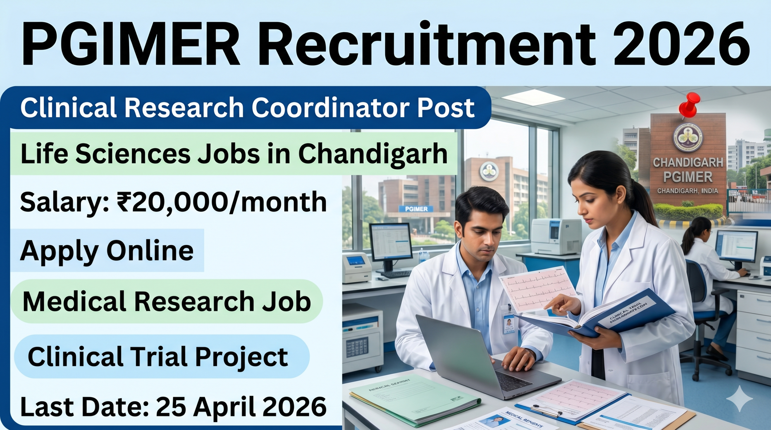 PGIMER Recruitment 2026 Sarkari Job Summary:Β If you are searching for a latest clinical research coordinator job in Chandigarh 2026, here is an excellent opportunity from Postgraduate Institute of Medical Education and Research. The institute has released an official notification for the recruitment of a Clinical Research Coordinator on a contract basis under a prestigious clinical trial project.
