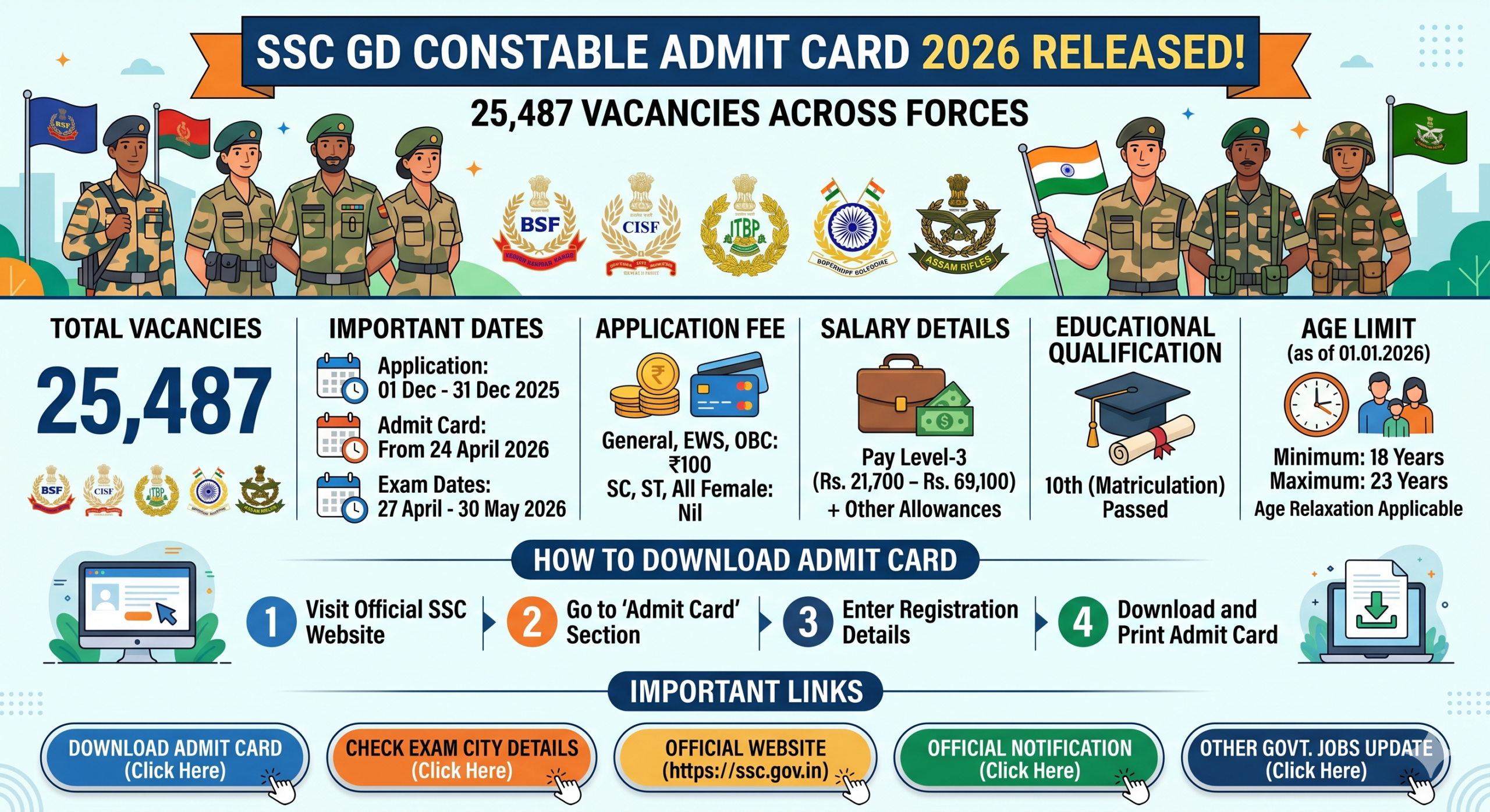 The Staff Selection Commission has released the SSC GD Constable Admit Card 2026 for 25,487 vacancies across forces like BSF, CISF, ITBP, CRPF, and Assam Rifles. The exam will be conducted in multiple cities across India from 27 April to 30 May 2026. Candidates are advised to check the official notification or follow the steps to download the admit card.